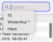 - Tippen Sie eine Zeichenfolge solange, bis die Liste das gewünschte Suchresultat anzeigt. Die Suche beschränkt sich auf die relevanten Spalten. Die fünf neusten Suchanfragen werden gespeichert und bleiben auch nach dem Beenden des Helpers erhalten. Zudem ist es möglich Suchanfragen mit Alt + Klick in der Aufklappliste zu favorisieren (gekennzeichnet mit *). Die Favoriten bleiben solange erhalten bis Sie sie entfernen. Löschen können Sie Suchanfragen mit Shift + Klick.