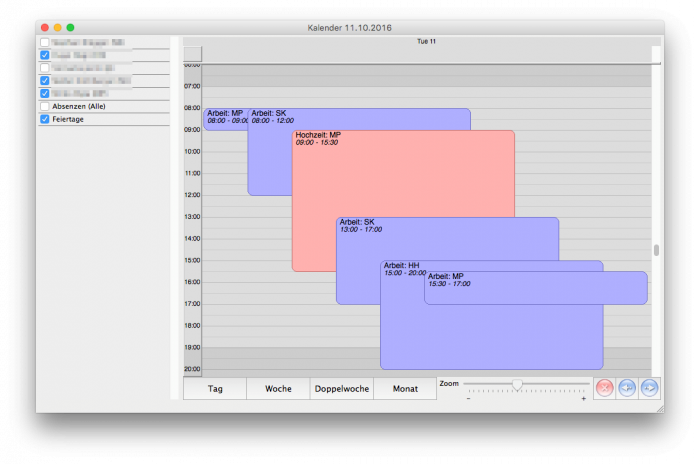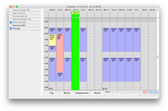 Die Doppelwochenansicht ist insofern speziell, dass man normalerweise eine Woche springt, allerding die Möglichkeit hat durch Drücken der Shift-Taste beim Blättern einen Tag zu springen. Die Dauer von Absenzen (Rot) kann durch verschieben der oberen und der unteren Kante verändert werden.