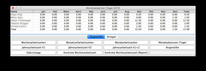 Durch Klick auf Monatsarbeitszeiten bekommt man eine Übersicht über die Tage die jeder Angestellte pro Monat im gewünschten Jahr aufgrund von Absenzen fehlt.