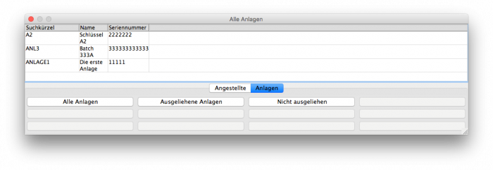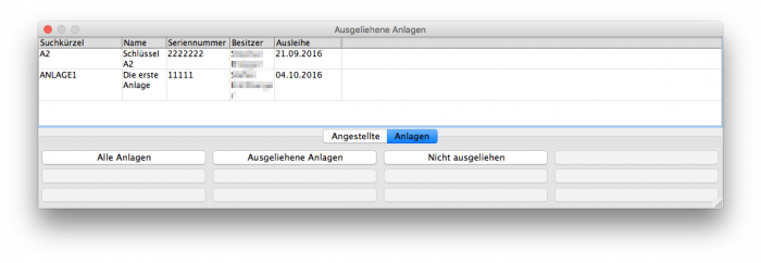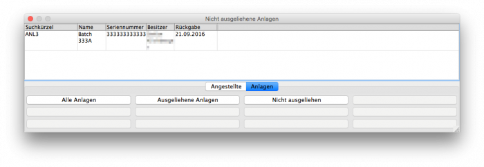 Durch Klick auf '''Ausgeliehene Anlagen''' bekommt man eine Übersicht über alle Anlagen, die momentan bei Angestellten sind. Es werden der derzeitige Besitzer und das Datum der Ausleihe angezeigt. | Durch Klick auf '''Ausgeliehene Anlagen''' bekommt man eine Übersicht über alle Anlagen, die momentan bei Angestellten sind. Es werden der derzeitige Besitzer und das Datum der Ausleihe angezeigt. | ||