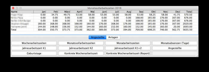 Durch Klick auf Monatsarbeitszeiten bekommt man eine Übersicht über die Stunden die jeder Angestellte pro Monat im gewünschten Jahr arbeitet.
