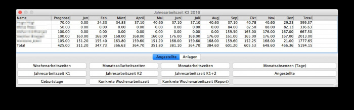Durch Klick auf Monatsarbeitszeiten K2 bekommt man eine Übersicht über die Stunden die jeder Angestellte pro Monat im gewünschten Jahr arbeitet.