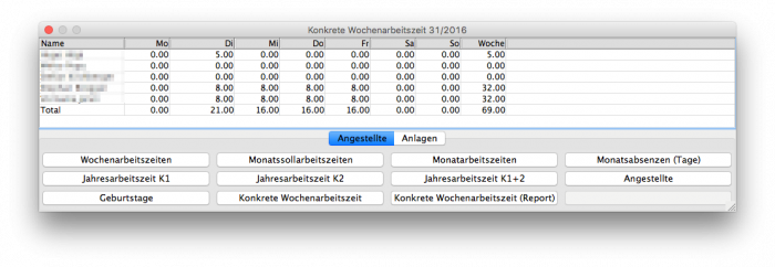 Durch Klick auf Konkrete Wochenarbeitszeit bekommt man eine Übersicht über die Stunden die jeder Angestellte in einer gewünschten Woche arbeitet.