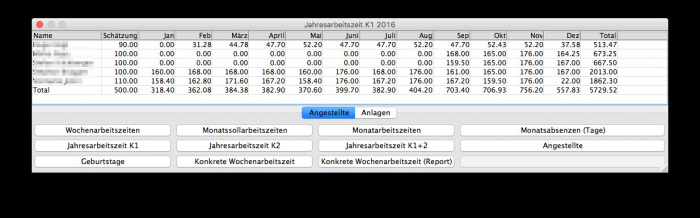 Durch Klick auf Monatsarbeitszeiten K1 bekommt man eine Übersicht über die Stunden die jeder Angestellte pro Monat im gewünschten Jahr arbeitet.