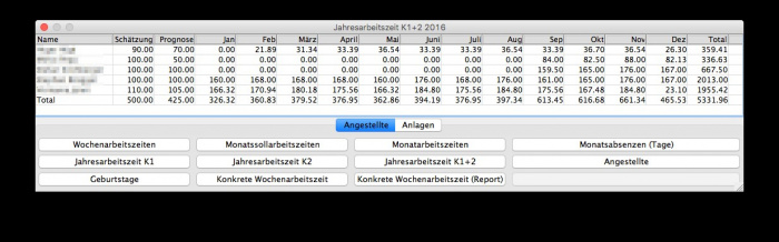 Durch Klick auf Monatsarbeitszeiten K1+2 bekommt man eine Übersicht über die Stunden die jeder Angestellte pro Monat im gewünschten Jahr arbeitet.