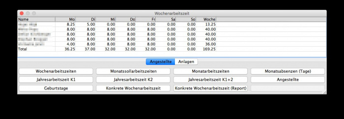 Durch Klick auf Wochenarbeitszeiten bekommt man eine Übersicht über die Stunden die jeder Angestellte pro Wochentag arbeitet.