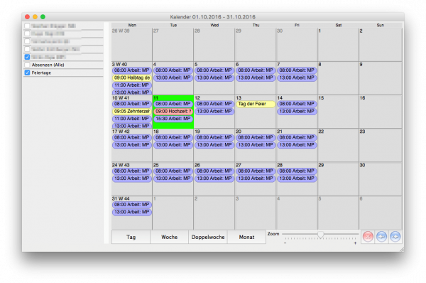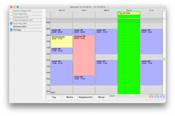 Die Doppelwochenansicht ist insofern speziell, dass man normalerweise eine Woche springt, allerding die Möglichkeit hat durch Drücken der Shift-Taste beim Blättern einen Tag zu springen. Die Dauer von Absenzen (Rot) kann durch verschieben der oberen und der unteren Kante verändert werden.