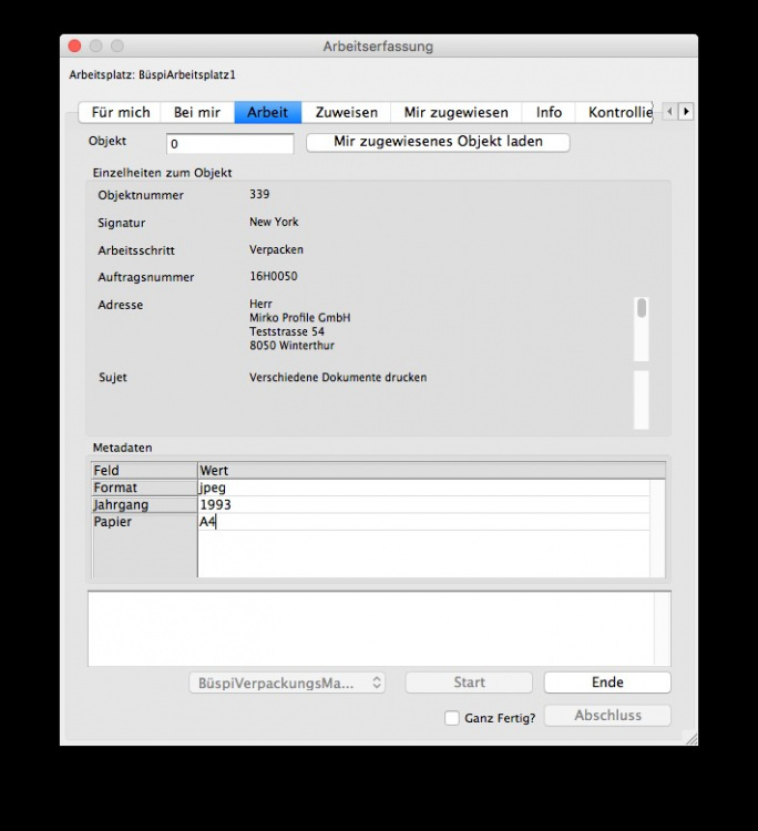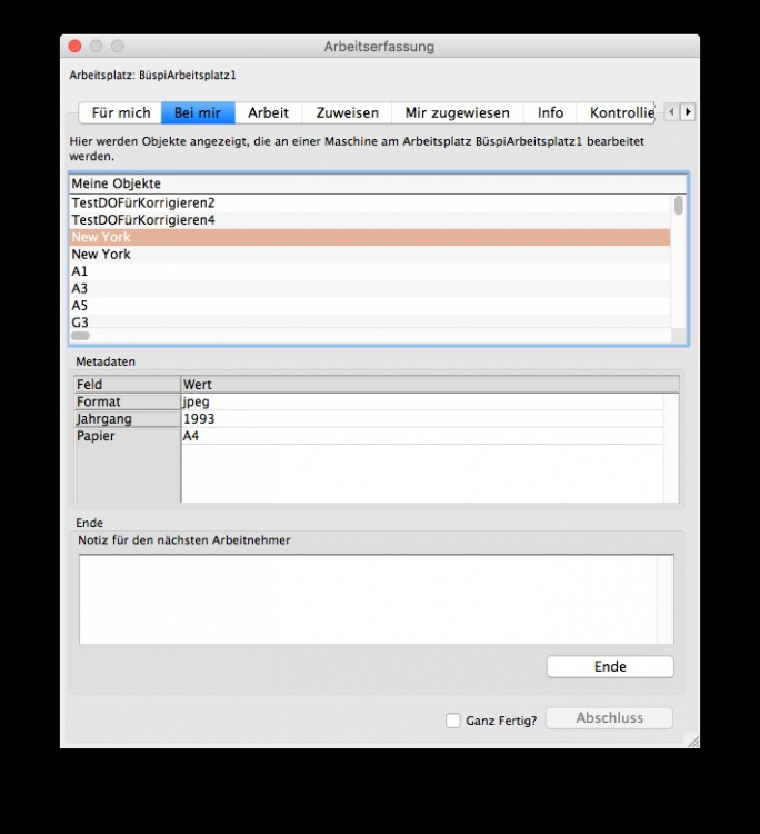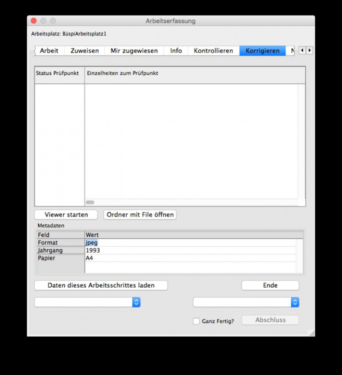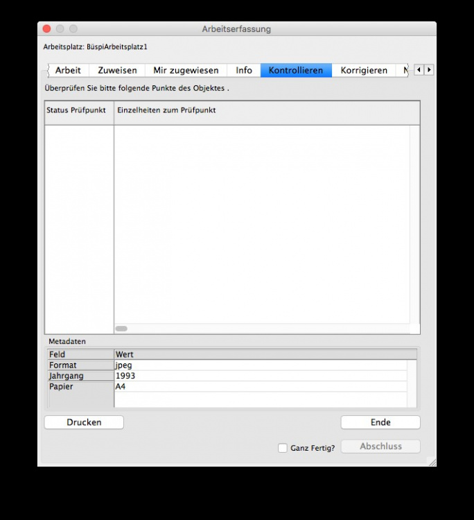 Wenn ein Objekt Metadaten haben kann, dann ist möglich diese in den Registern '''Bei mir''' und '''Kontrollieren''' anzusehen. In den Registern '''Arbeit''' und '''Korrigieren''' können die Metadaten vor dem Beenden des Arbeitsschritts abgefüllt werden. | Wenn ein Objekt Metadaten haben kann, dann ist möglich diese in den Registern '''Bei mir''' und '''Kontrollieren''' anzusehen. In den Registern '''Arbeit''' und '''Korrigieren''' können die Metadaten vor dem Beenden des Arbeitsschritts abgefüllt werden. | ||