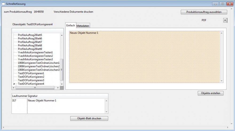 In dieser Maske hat der Benutzer die Möglichkeit Objekte/DO zu bearbeiten resp. zu erstellen. Auch in diesem Fenster besteht die Option eine Hierarchie innerhalb der Objektstruktur zu machen. Zusätzlich können Objekte/DO als Kinder zu schon bestehenden Mutterobjekten erstellt werden. Der Benutzer muss hierbei ein schon bestehendes Objekt/DO in der linken Liste anwählen, bevor er die Taste „Objekte erstellen“ betätigt. Im Vergleich zur ersten Maske kann in diesem Fenster mit einem Handscanner gearbeitet werden (Tab1-Einfach) oder eine schon erstellte Tabelle eingefügt werden (Tab2-Metadaten). Es können somit mehrere Objekte auf einmal erstellt werden.