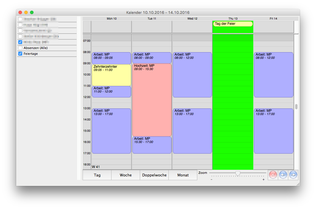 Des Weiteren kann man die Anzahl Stunden, die pro Tag angezeigt werden zwischen 1 und 24 zoomen (Zoom). Mit den Pfeiltasten blättert man eine Ansicht vorwärts oder zurück. Wenn man in der Tagesansicht ist, dann springt man einen Tag, in der Wochenansicht eine Woche und in der Monatsansicht einen Monat.
