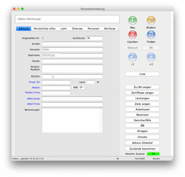 In diesem Fenster kann man die Details der Angestellten bearbeiten und einige der neuen Fenster öffnen.