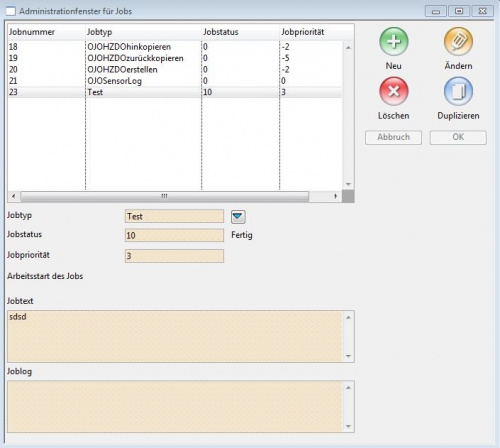 Dieses Fenster bietet dem Benutzer eine Übersicht aller laufenden Jobs. Je nach Bedarf können diese geändert, gelöscht oder neu erstellt werden.