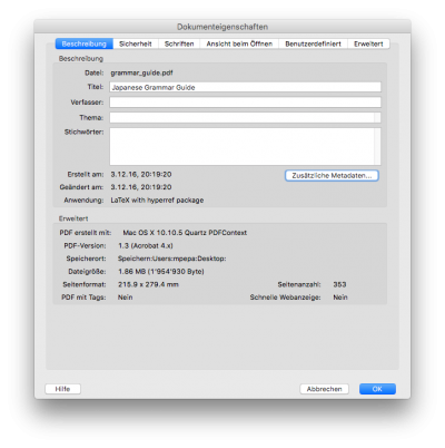 - Wenn ja, benutzen wir idealerweise diese Felder. Wollen Sie zB den Autor und den Titel einbetten, gibt es dafür die perfekten Felder. Ihre Files werden damit universeller verwendbar. Es ist für andere Softwaren einfacher, vordefinierte Felder auszulesen. Oft macht das schon das Betriebssystem und hilft Ihnen dadurch bei der Suche.