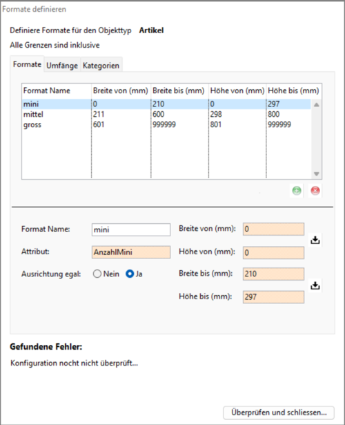 In diesem Fenster können Sie interessante Formate, Umfänge und Kategorien definieren, welche Sie messen möchten und somit in Auswertungen im Blick haben. Einige Beispiele: "Wie viele der Bücher sind dick (> 50 Seiten)", "Wie viele Seiten meines Ordners sind gross (> A3)?", "Wie viele Bücher kann ich als teuer verrechnen? (> 50 Seiten und mindestens 15 grosse Seiten)