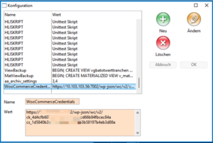 Nun müssen diese Zugangsdaten im Helper hinterlegt werden. Navigieren Sie dazu zu Hauptmaske → Einstellungen → Tabellen → Grundeinstellungen → Konfiguration. Legen Sie einen neuen Datensatz mit dem Namen "WooCommerceCredentials" (wichtig!) an. Tragen Sie folgende Werte ein: