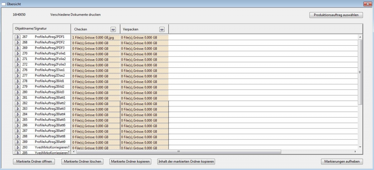 Diese Maske gibt dem Benutzer die Möglichkeit mit den bestehenden Ordner aller Objekte/DO eines bestimmtem Produktionsauftrages/HK zu interagieren. Markierte Ordner öffnen, löschen, kopieren.
