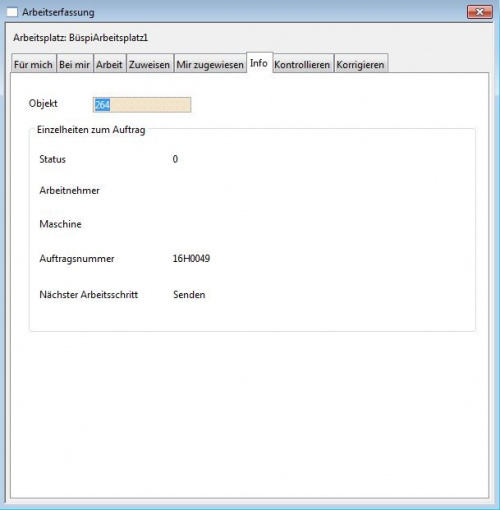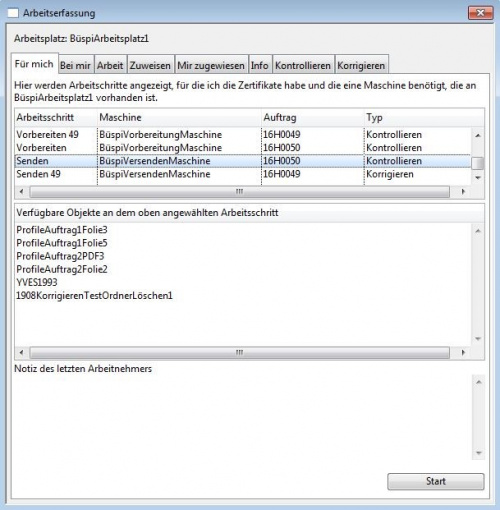 Mit der Taste „Start“ wird das angewählte Objekt/DO gestartet. Es ist nun mit meinem Arbeitsplatz/AB resp. dessen Maschine/MA verknüpft (DO_MA_SEQ) und erhält den Status „In Arbeit“ (DO_CHECKSTATUS=1). Zusätzlich wird eine Leistung/LS erstellt.
