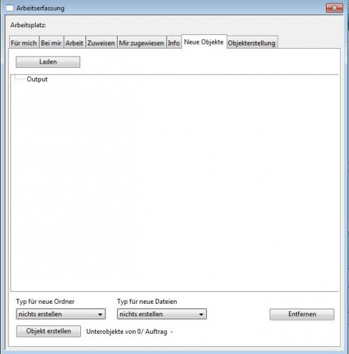 Dieser Teil des Fensters dient dazu aus den Dateien im Output-Ordner Unterobjekte des aktuellen Objekts zu erstellen. Durch Klick auf Laden werden alle Dateien im Output-Ordner in die Liste geladen. Mit der Taste Objekt erstellen wird das Unterobjekt erstellt und mit Entfernen können Dateien aus der Liste entfernt werden.