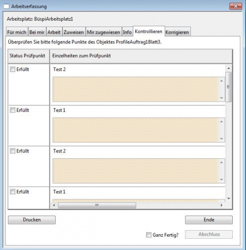 Taste „Drucken“, um eine Liste aller Prüfpunkte/PR zu erhalten, welche der damit vertraute Mitarbeiter/AN unterschreiben kann. Dient als Überprüfung für einen Gruppenleiten (o.ä Position).