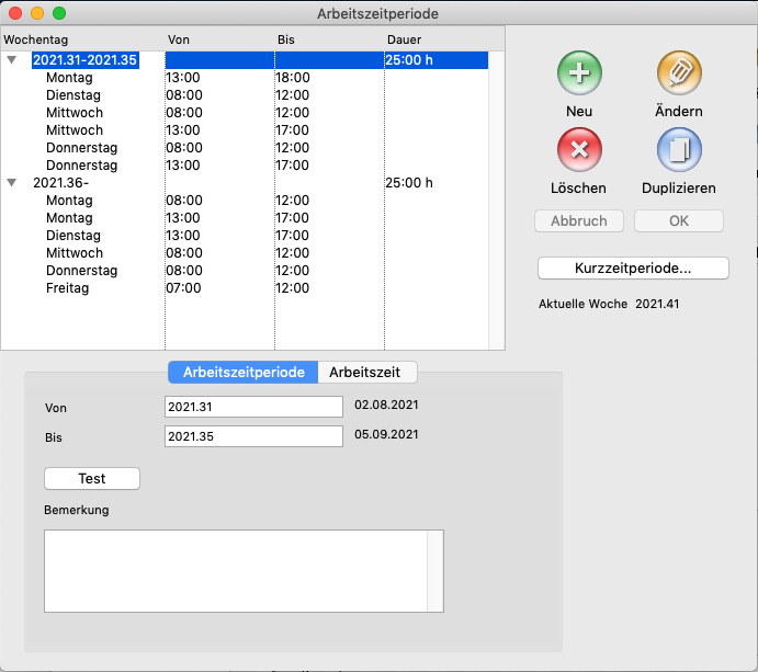 In diesem Fenster können die Arbeitszeitperioden eines Angestellten festgelegt werden. Dafür klicken Sie auf Neu und wählen Sie "neue Arbeitzeitperiode".