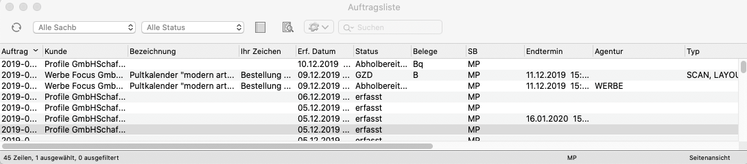 - Die Suche beschränkt sich auf die wesentlichen Spalten. Auch Ziffern sind möglich (z. B. Auftragsnummer).