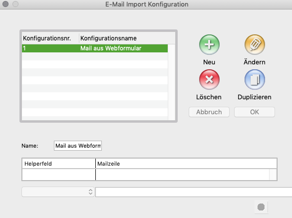 In diesem Fenster können die Schnittstelleninformationen eingegeben werden, damit die Informationen aus der E-Mail in die richtigen Felder in Helper abgefüllt werden.