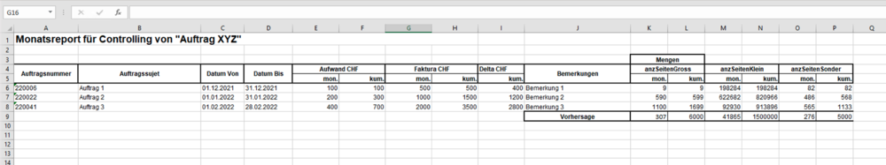 Der Monatsreport Controlling ist eine Excel Auswertung, welche basierend auf einem Produktionsauftrag und den verknüpften Aufträgen, nützliche Daten wie Aufwände, Erträge sowie die Arbeitsleistung zusammenstellt.