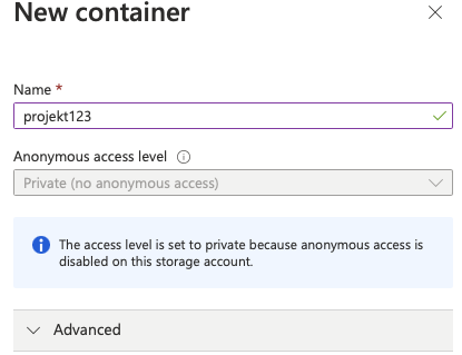 Um einen neuen Conotainer für ein Projekt anzulegen, klicke im Browser auf den Menupunkt "Blob containers" und dann in der Menuleiste auf "Add container". Gibt dem container eine wiedererkannbare Bezeichnung für dein aktuelles Projekt.