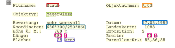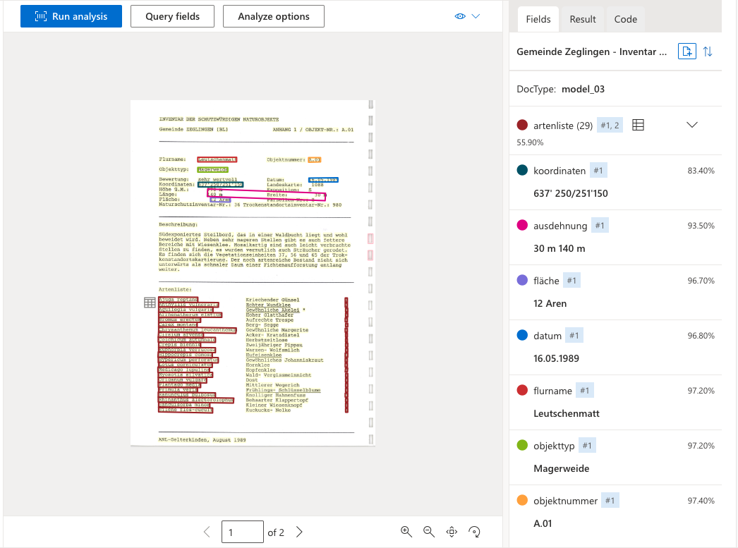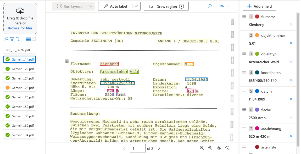 Lasse danach die Analsye über ein markiertes oder über alle hochgeladenen Dokumente laufen. Auf der rechten Seite werden die Felder mit den Resultaten angezeigt. Im Dokument werden die erkannten Bereicher wiederum mit dem entsprechenden Feldfarben umrandet dargestellt.