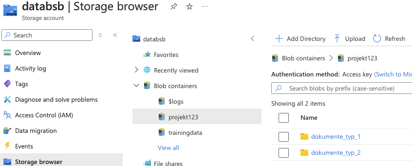 Die Verwaltung des speichers kann aktuell nur über das Azure Portal ausgeführt werden. Hier können die Projekt, bzw. Modelspezifischen Ordner angelegt und bearbeitet werden.