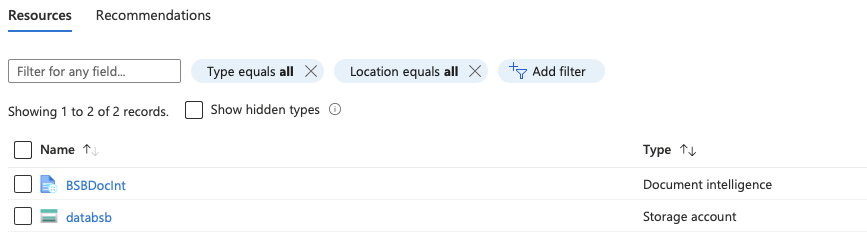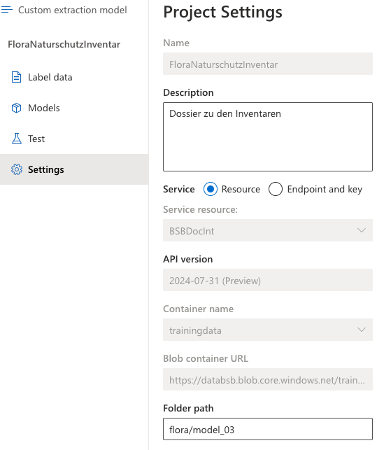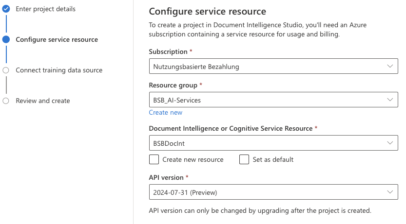 Die Resource des vorläufig ersten Document intelligence Objektes heisst "BSBDocInt". Es gibt dort keine weiteren Einstellungen, welche durch den Benutzer vorgenommen werden sollten.