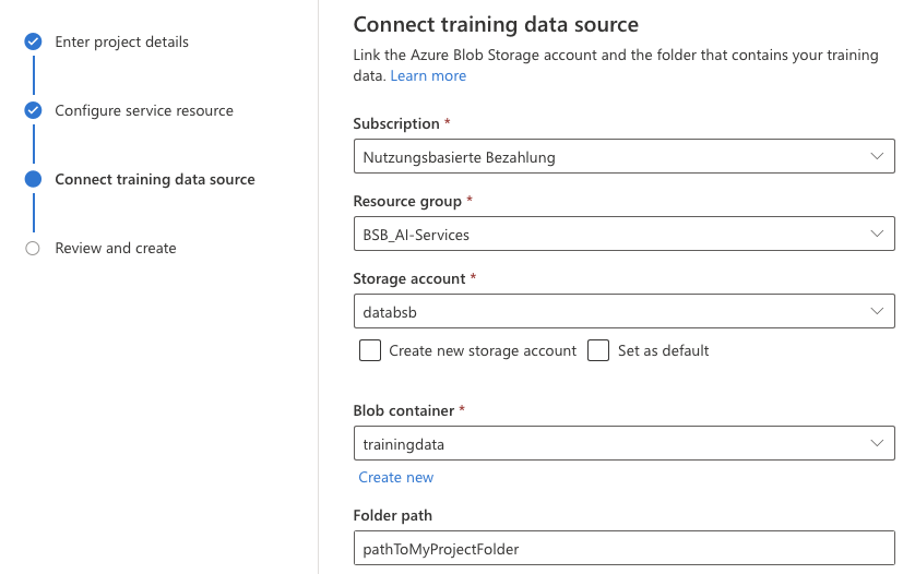 3. Richte die Datenquelle für das Training ein. Übernimm auch hier wieder die Einstellung aus der Grafik, bis auf den Parameter "Container" und "Folder path". Dort gibst du den Namen des Projektspezifischen Containers und des Dokumenten Ordners an. Der Folder Pfad kann später noch geändert werden, der Container nicht mehr!