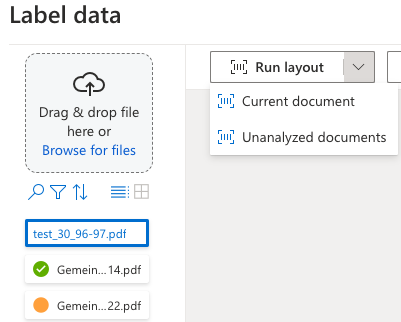 Neu hinzugefügte Dokumente haben noch keine farbliche Markierung vor dem Dateinamen und müssen über die Taste "Run layout" den Dokumenteanalyse Prozess durchlaufen. Dabei können sowohl einzlene Dokumente oder gleich alle nicht analysierten Dokumente verarbeitete werden.