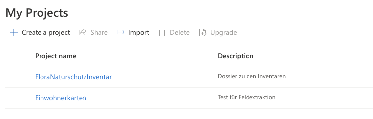 Klicke auf ein vorhandenes Projekt, um die Konfiguration der Daten und das training der Modelle zu öffnen.