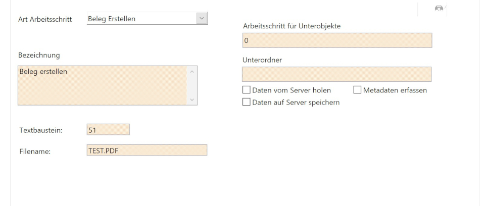 den Button «Platzhalter einfügen» eingefügt werden. Das Belegfile wird in den Ordner des vorherigen Serverarbeitsschrittes geschrieben.