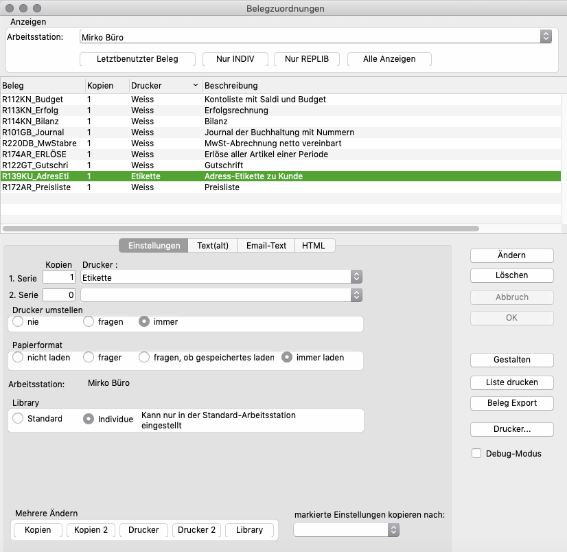 - Hier sehen Sie die Zuordnungen zu den Belegen zum oben ausgewählten Arbeitsstationsprofil.