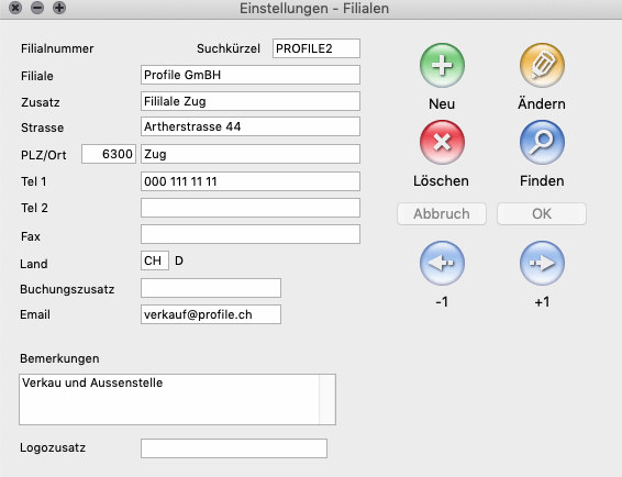 Dieses Fenster erreichen Sie unter «Einstellungen -> Tabellen -> Buchhaltung -> Filialen».