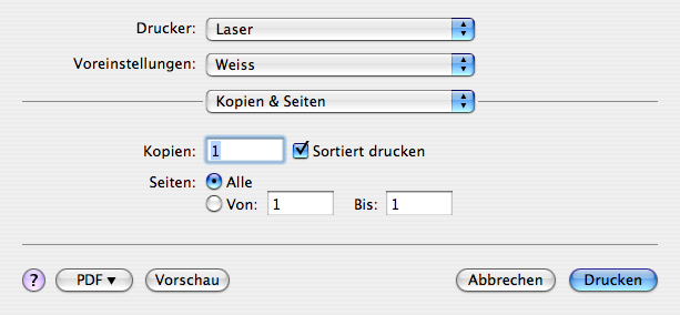 Der Print-Job-Setup-Dialog von Max OS X 10.4