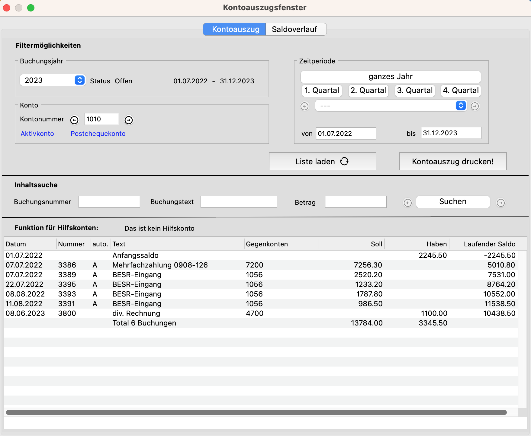 Kontoauszugsfenster Konto 1010 Jahr 2023