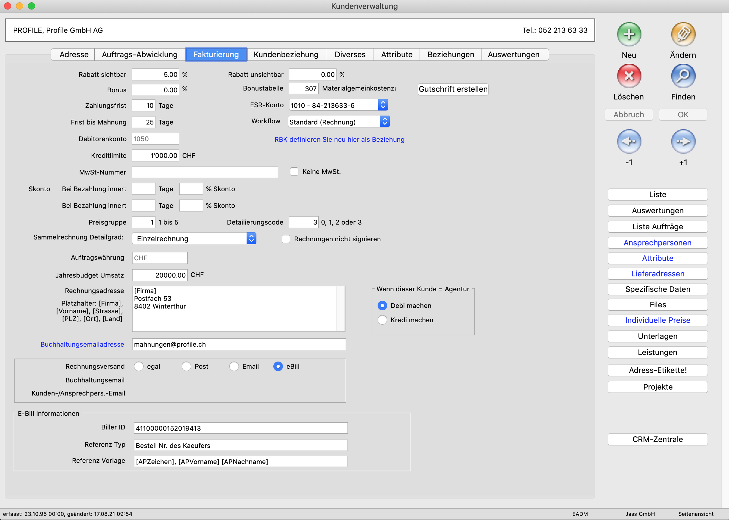 Screenshot der Kundenfaktorierungsseit inkl. E-Bill Informationen und Spezialfall Wenn dieser Kunde = Agentur.