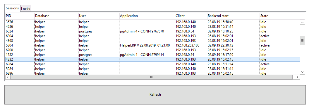 In dieser Ansicht sehen Sie die aktuellen Verbindungen zu den auf dem PosrgreSQL-Server laufenden Datenbank-Instanzen.