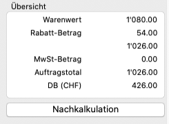 - Solange auch nur eine Zeile eines Auftrags den Wert NULL hat, wird der Deckungsbeitrag nicht berechnet, bzw. ist '0.00'.