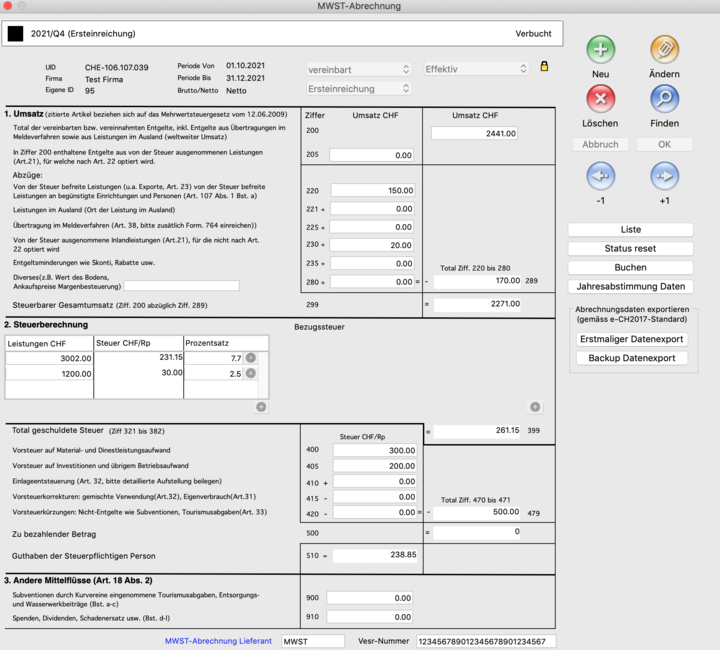 Erstellen Sie die MWST-Abrechnung mit den von Ihnen gewählten Einstellungen, indem Sie im Fenster davor zuerst auf "Daten laden" und anschliessend auf "MWST-Abrechnung erstellen" klicken.