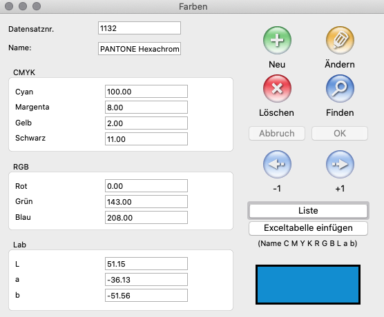 Hier können Sie Farbtabellen mit den Farb- und Umrechnungswerten im Excel-Format einlesen.