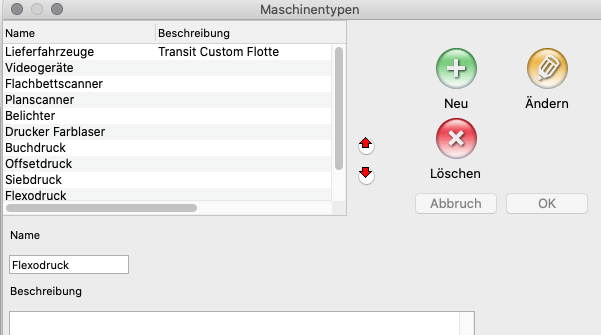Hier können Sie Maschinentypen festlegen, um Ihre Maschinen zu kategorisieren.
