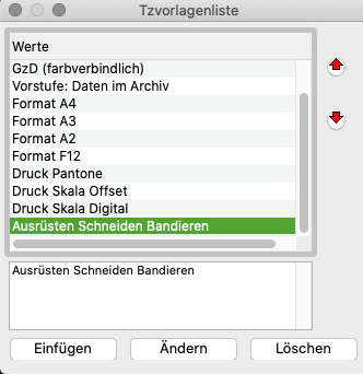 Dieses Fenster erreichen Sie unter «Einstellungen -> Tabellen -> Drucktechnisches -> Produktionsbeschreibungsvorlagen».