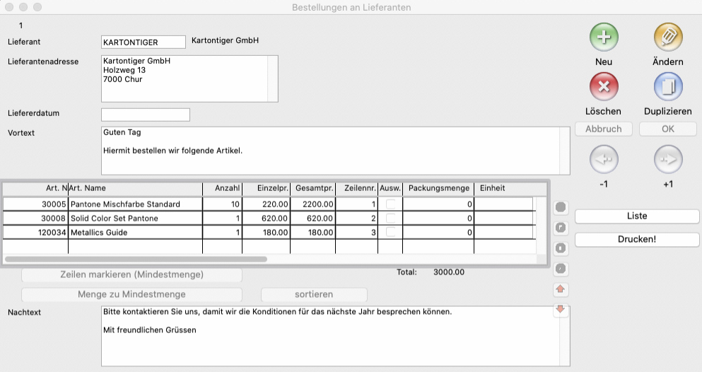 Abbildung: Lieferantenbestellung mit Beispielsdaten