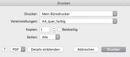 Das Druckdialog-Fenster erscheint vor dem Ausdrucken und ermöglicht die Einstellung vor dem Druckauftrag noch anzupassen und z.B. die Anzahl der zu druckenden Exemplare zu erhöhen.