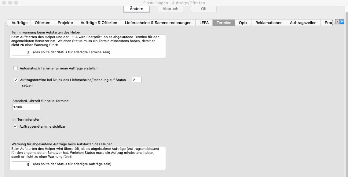 Dies kann beispielsweise das Ende des Arbeitstages sein (z. B.17:00). Die Uhrzeit kann in den einzelnen Aufträgen nochmals angepasst werden.