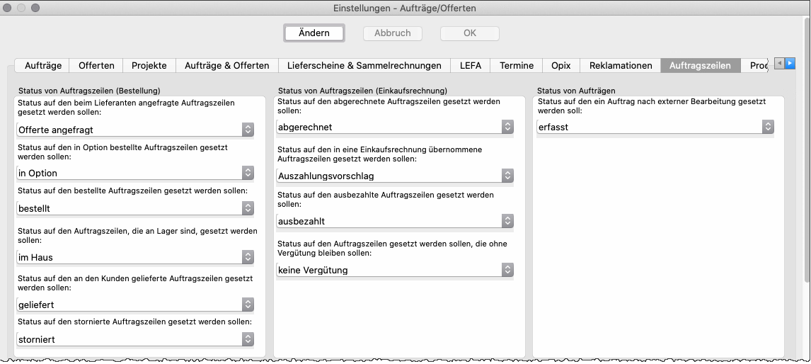 Hier können Sie den Status auswählen, den eine Offertzeile erhält, wenn eine Fremdleistung angefragt wurde.